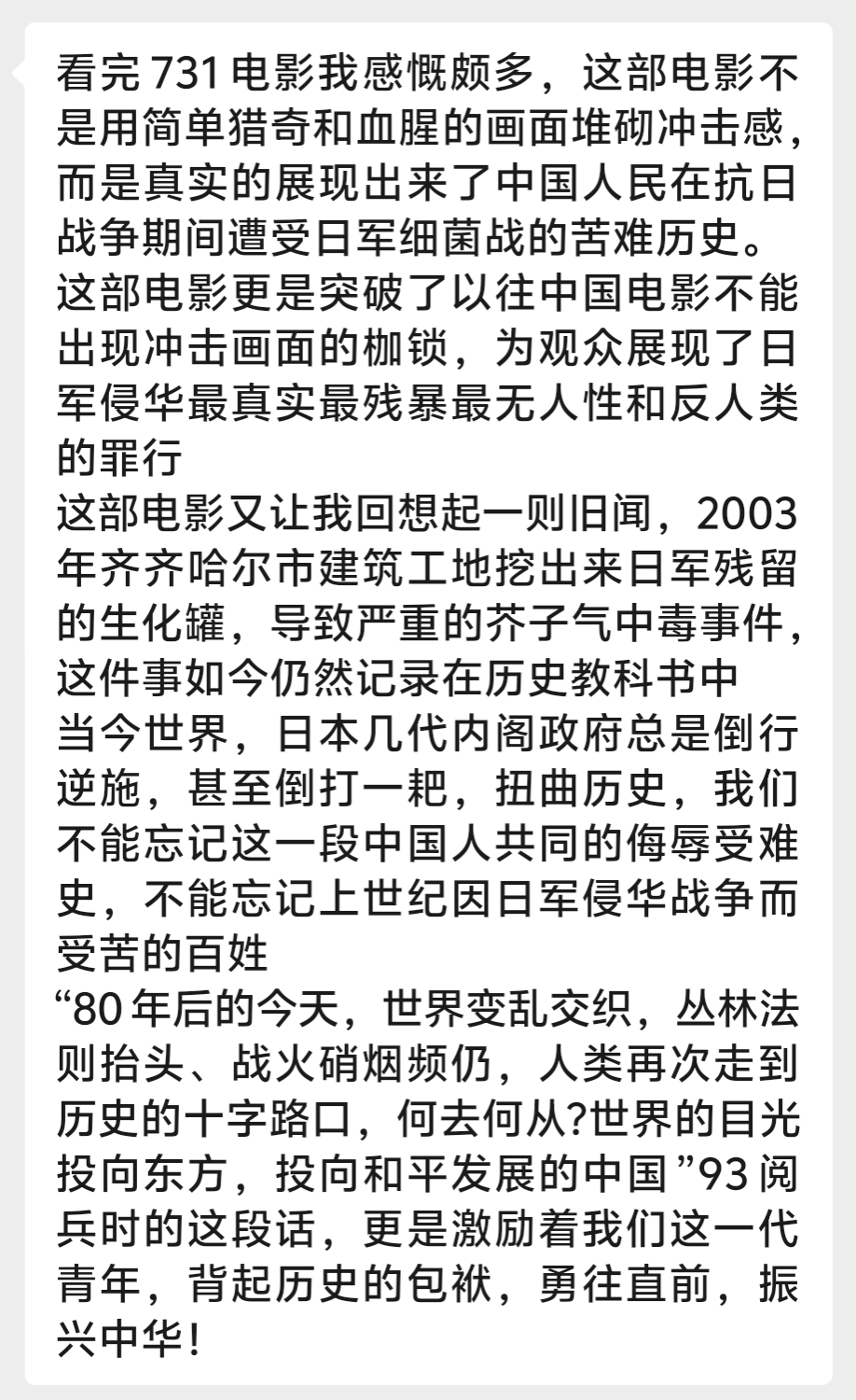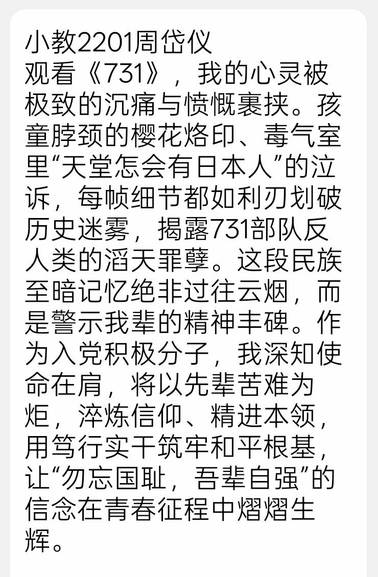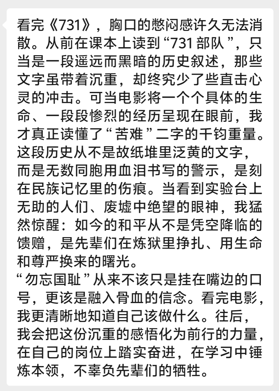 本次活动由教育学院学生党支部吴桂芳、李三梅、张娜、陈伟萍三位老师带队,组织支部全体成员集中观看爱国主义题材影片《731》。影片以真实历史为底色,深刻揭露了 731 部队反人类的滔天罪行,生动展现了中华民族在苦难岁月中不屈不挠、顽强抗争的伟大民族精神。观影过程中,支部成员全程神情专注,随着剧情推进,大家被影片中震撼人心的历史场景、感人至深的抗争故事深深触动。透过银幕,支部成员真切感受到中华民族曾遭受的深重灾难,更深刻理解了中国共产党带领人民浴血奋战、走向民族复兴的历史必然性,进一步坚定了 “听党话、跟党走” 的政治自觉。