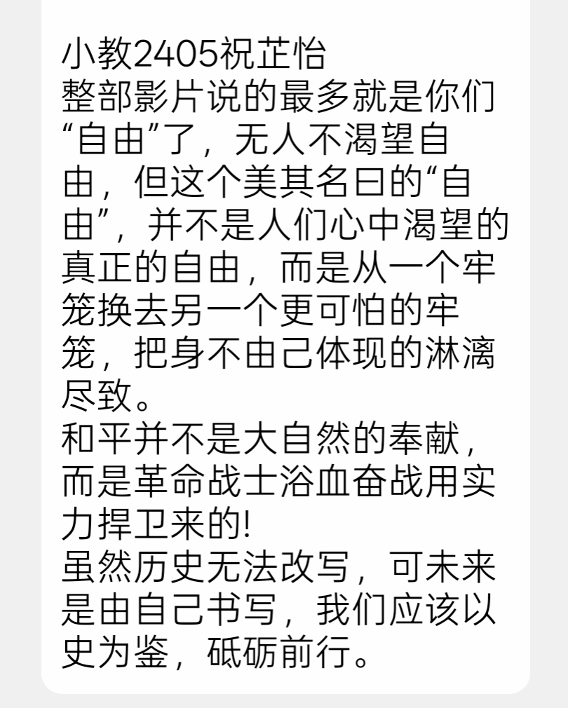 观影结束后,支部随即开展交流分享会,成员们结合影片内容与自身学习、思想实际,踊跃畅谈感悟与思考。交流中,大家一致表示,此次观影活动不仅是一次历史教育,更是一次精神洗礼。未来将以此次活动为契机,始终铭记民族苦难历史,珍惜当下和平生活,主动传承红色基因、弘扬爱国主义精神,以过硬的政治素养、扎实的专业能力,努力成长为担当民族复兴大任的时代新人,为国家发展、民族进步贡献青春力量。