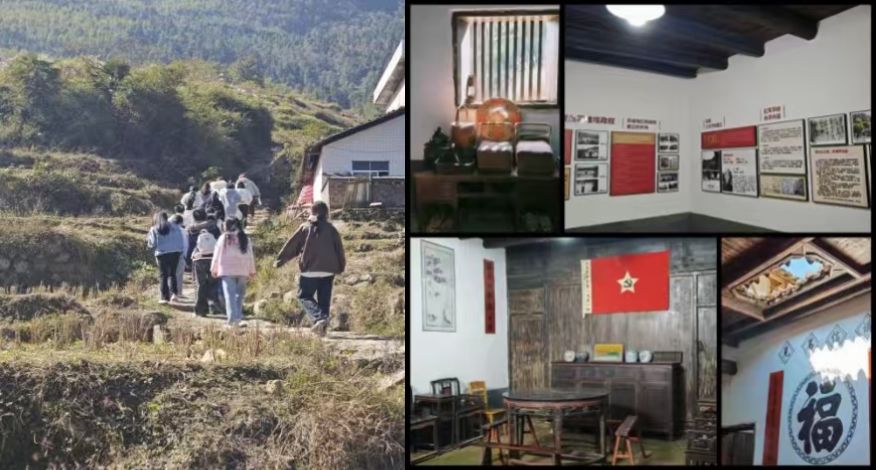 清晨8时,研学队伍集合出发,首站抵达张家坊王家大屋。党支部成员首先重温了红军当年的行军路,体会当年行军的不易。接着在当地讲解员的引导下,成员们实地参观了这座赣派民居的天井院落、雕梁画栋,重点记录了革命时期留下的标语、旧物,以及“王家大屋在革命时期的作用”“当地革命先辈事迹”等红色线索。