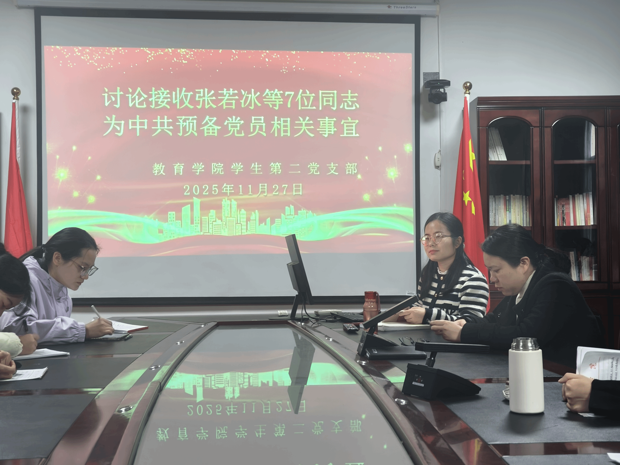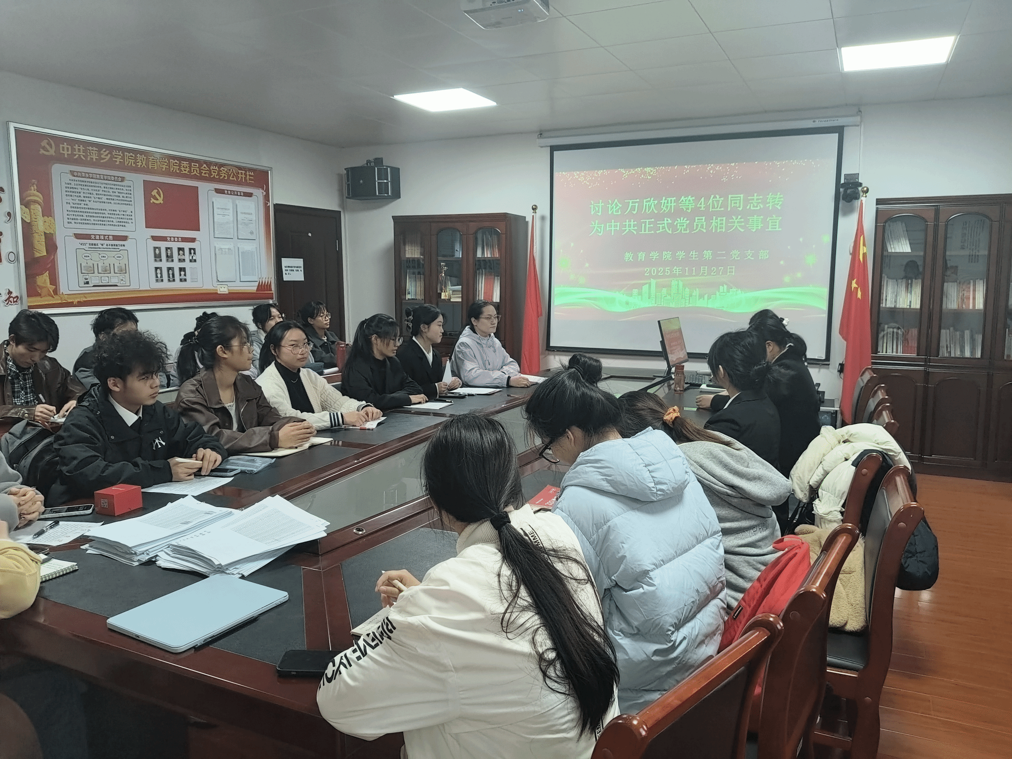 为强化理论武装、严把党员发展质量关,凝聚支部奋进力量,2025年11月27日下午4点,教育学院学生第二党支部在学院3247会议室召开党员大会。会议由党支部书记李三梅主持,支部全体党员、部分入党积极分子参会。