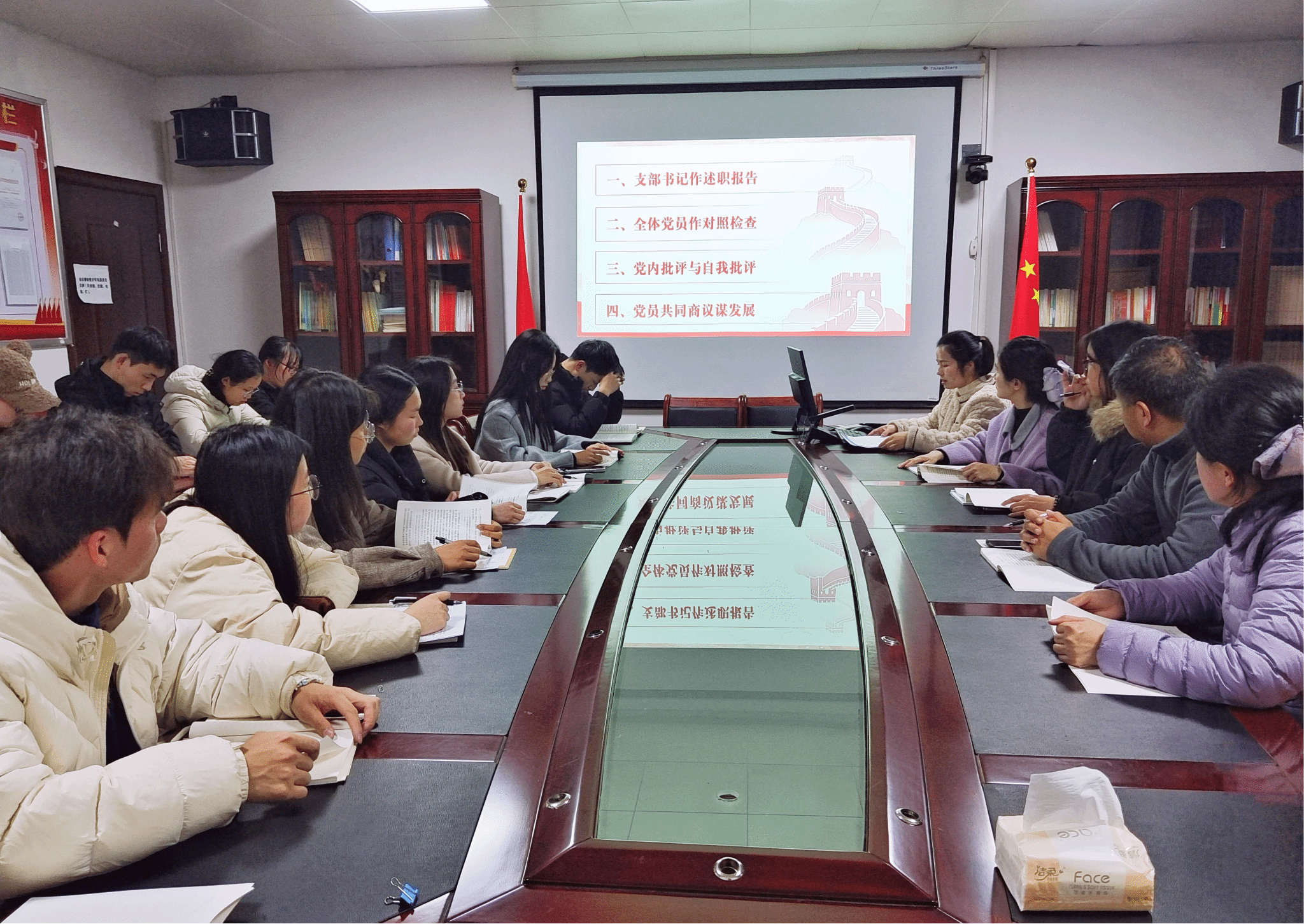 本次组织生活会以“深入学习贯彻习近平新时代中国特色社会主义思想,全面贯彻落实党的二十届四中全会精神,以打攻坚战、持久战的决心和恒心,锲而不舍落实中央八项规定精神,推进作风建设常态化长效化,以优良作风凝心聚力、真抓实干,奋力开创中国式现代化建设新局面”为主题,设置支委会述职、个人对照检查、批评与自我批评、商议整改方案四项核心议程。