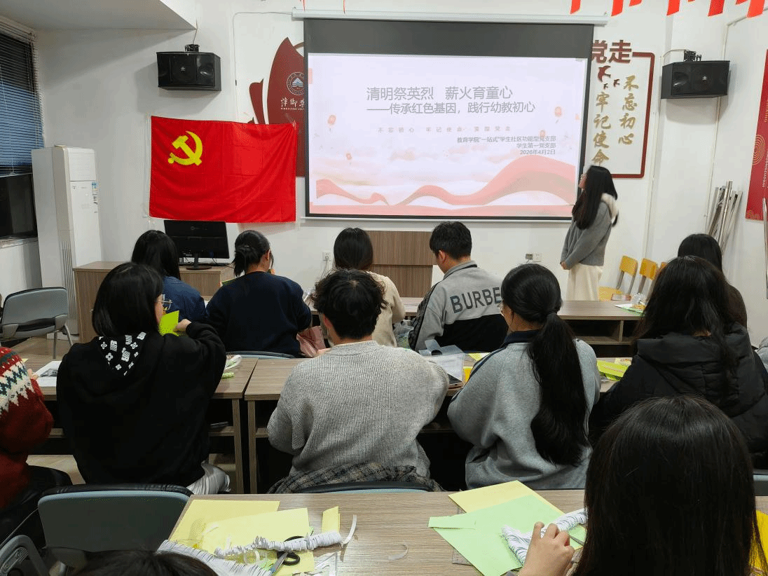 2026年4月2日,教育学院“一站式”学生社区功能型党支部、学生第一党支部在18栋党员活动室开展了“清明祭英烈,薪火育童心”主题教育活动,旨在通过缅怀革命先烈,厚植家国情怀,加深对党的历史与革命精神的认知,同时结合学前教育专业特色,推动红色文化与专业教育深度融合。