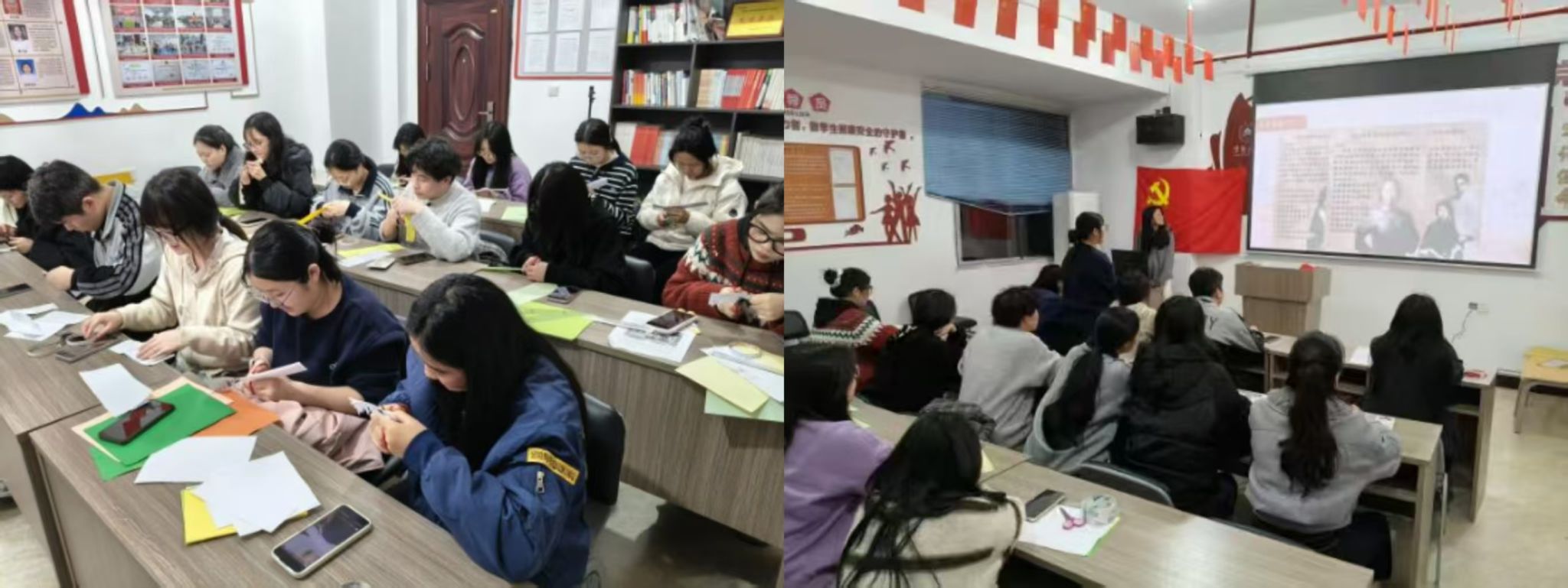本次活动主要分为五个部分。第一部分是开场默哀,致敬先烈。全体人员肃立,低头默哀,向为革命事业英勇献身的先烈们致以最深切的哀思与最高的敬意。第二部分是专题学习,感悟精神。通过观看纪录片片段与深入学习卢德铭事迹,同学们深刻感悟到革命精神的真谛。第三部分是诵读家书,初心共鸣。革命烈士的红色家书被深情诵读,字字句句都透露出烈士们的家国大义与对亲人的无尽牵挂,深深触动了在场的每一个人。第四部分是手工制作,寄情追思。同学们结合学前教育专业特色,亲手制作小白花与追思卡,将对先烈的缅怀与对幼教事业的热爱融入其中。第五部分是总结寄语,砥砺前行。支部负责人强调大家要以此为契机,传承革命先辈精神,端正入党动机,立足专业学习,锤炼自身品格,发挥党员先锋模范作用。