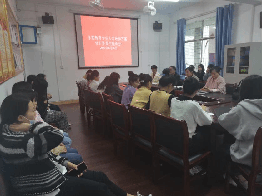 2021年4月26日下午3:00学前教育学院在四如楼五楼党员活动室召开学前教育专业人才培养方案修订及毕业生考研经验分享座谈会。本次会议由党总支书记胡艳维主持,参会人员有学前教育学院院长贺晓梅、副院长彭香萍、党总支副书记阳学文、学生党支部书记郑娟、辅导员张沙以及14位17级已录取研究生和18级本科班代表。