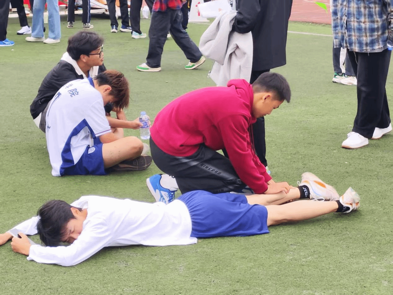 运动场上,在男子800米比赛后,我院一名运动员瘫坐在地,他的同行伙伴立刻上前,单膝跪地,用熟练的手法为他按摩放松僵硬的双腿。这及时的援手,是同伴间最坚实的支持,也让那因极限消耗而疲惫的身心得到放松。