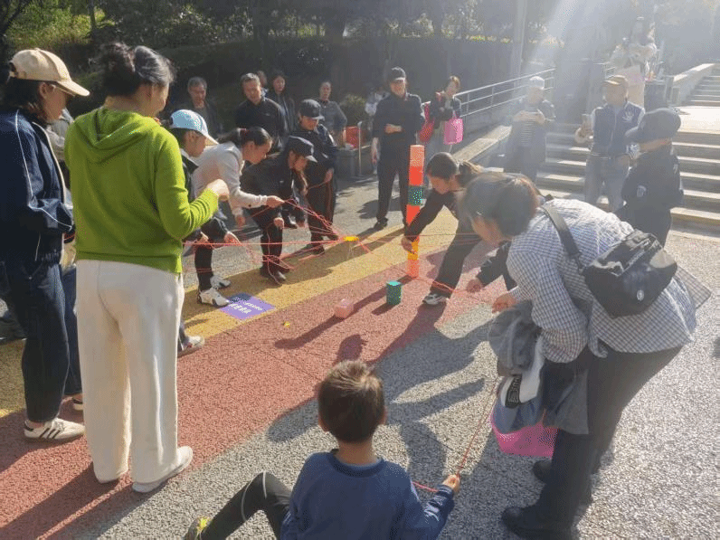 最具创意的“能量传输”游戏将活动推向高潮。20个U形管、若干乒乓球成为亲子间默契协作的“纽带”,每组亲子排成一列,手持U形管依次衔接,小心翼翼地将乒乓球从起点传递至终点的小杯子中。过程中,大家不断调整管道角度、精准配合,有的亲子轻声交流技巧,有的合力化解乒乓球掉落的危机,在欢声笑语中体验着团队协作的乐趣,也让“责任”与“配合”的意识在互动中悄然传递。