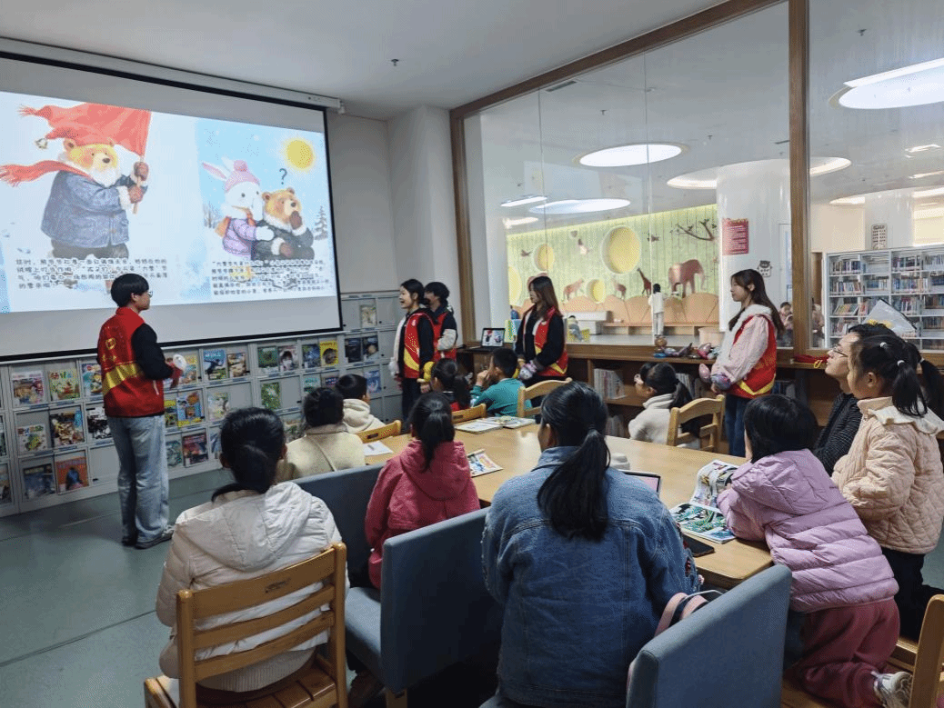 活动在欢快的手指律动中拉开序幕。志愿者们精心编排的“冬日手势舞”,迅速点燃了现场气氛,孩子们跟着节奏快乐舞动。随后,志愿者们通过声情并茂的绘本故事演绎,让孩子们知晓了“大雪”节气的特征。孩子们听得入神,仿佛跟随故事走进了银装素裹的童话世界。