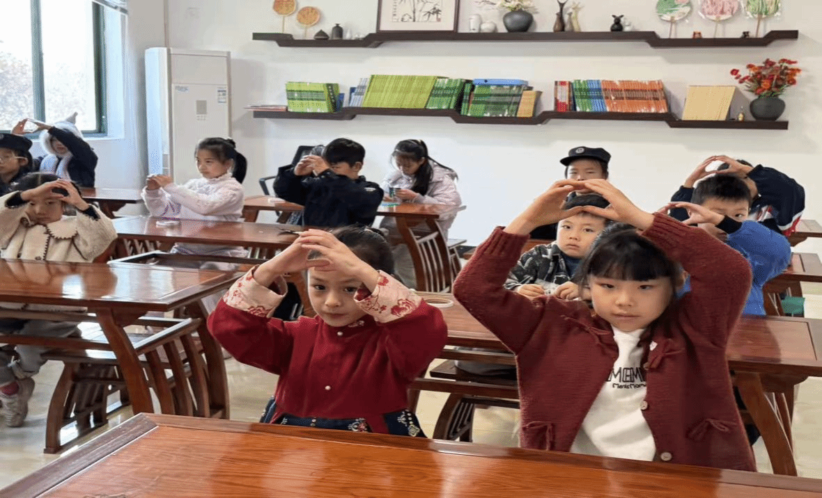 问答环节后,教学进入核心阶段——手势舞教学。当诗句进行至“春风送暖入屠苏”时,孩子们在志愿者引导下学习传统举杯手势,双手虚握如捧暖饮,动作间仿佛嗅到新春药草的芬芳;朗读“千门万户曈曈日”时,孩子们双手举过头顶,比划出圆圆的太阳手势,指尖绽放着明亮的光芒,仿佛将新春第一缕朝阳捧在手心。
