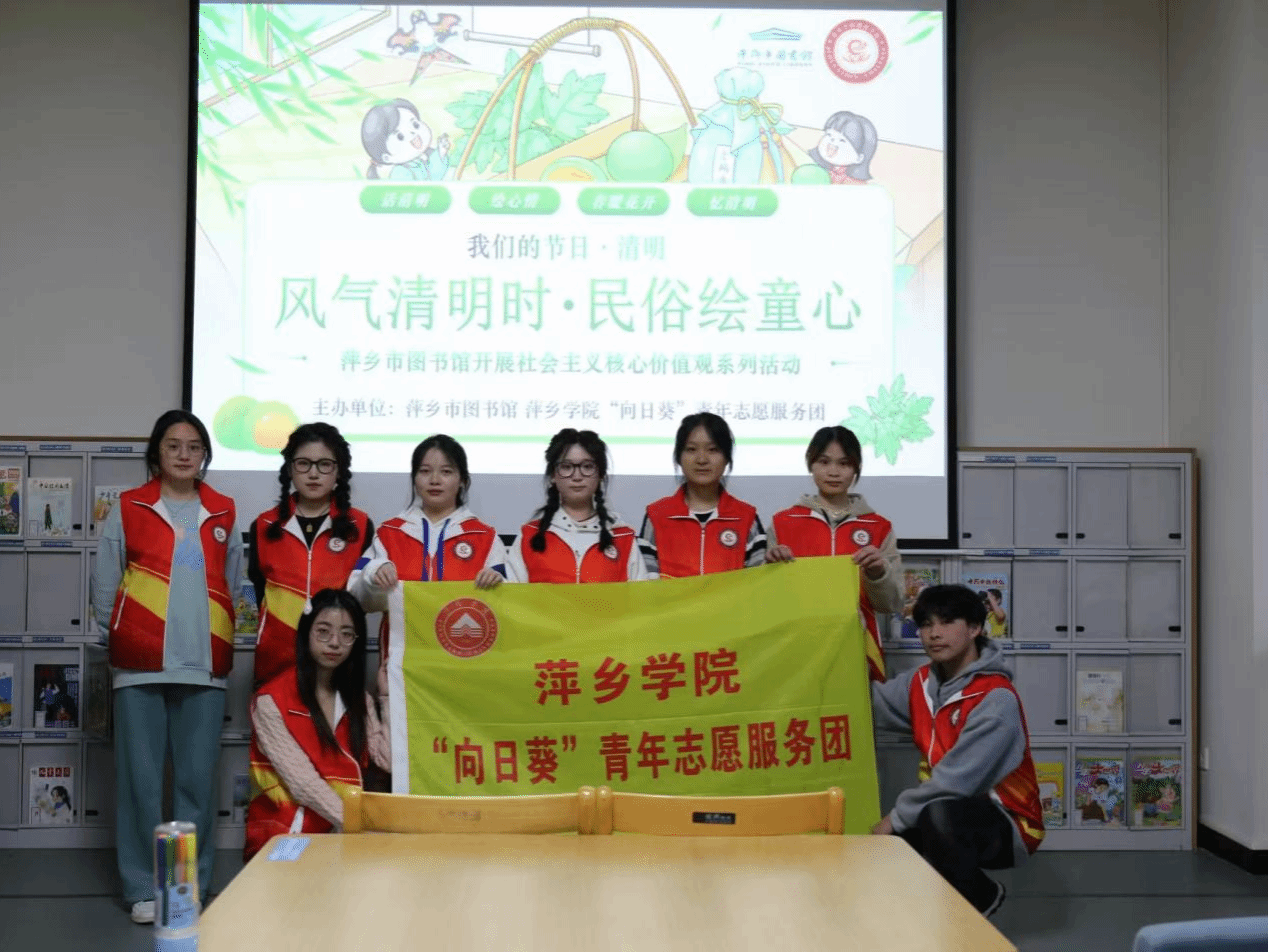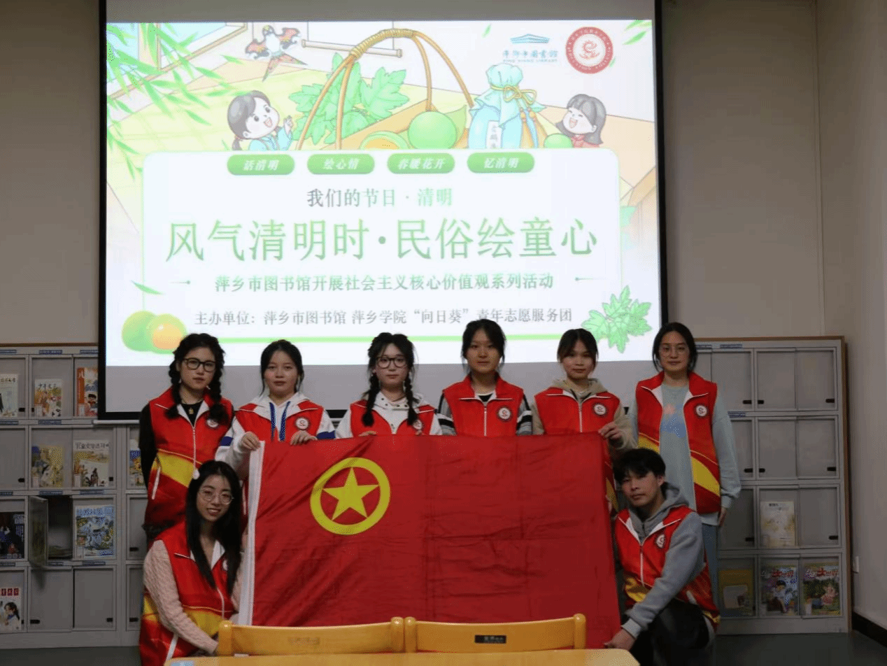梨花风起正清明,慎终追远润心田。为传承中华传统文化,弘扬爱国主义精神,萍乡学院“向日葵”青年志愿服务团于4月4日下午在萍乡市图书馆组织开展了“风气清明时,民俗绘童心”主题绘本讲解志愿服务活动。此次活动通过生动的绘本故事、互动体验和手工绘画,引导孩子们了解清明节的深厚文化内涵,在孩子们幼小的心灵中播撒爱国与感恩的种子。