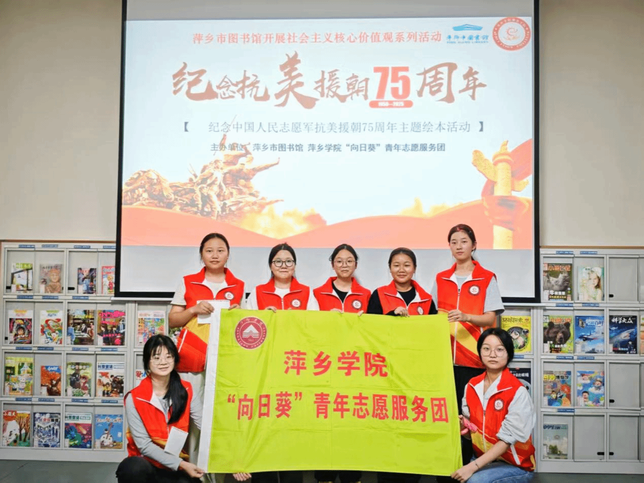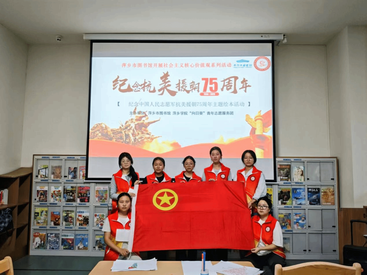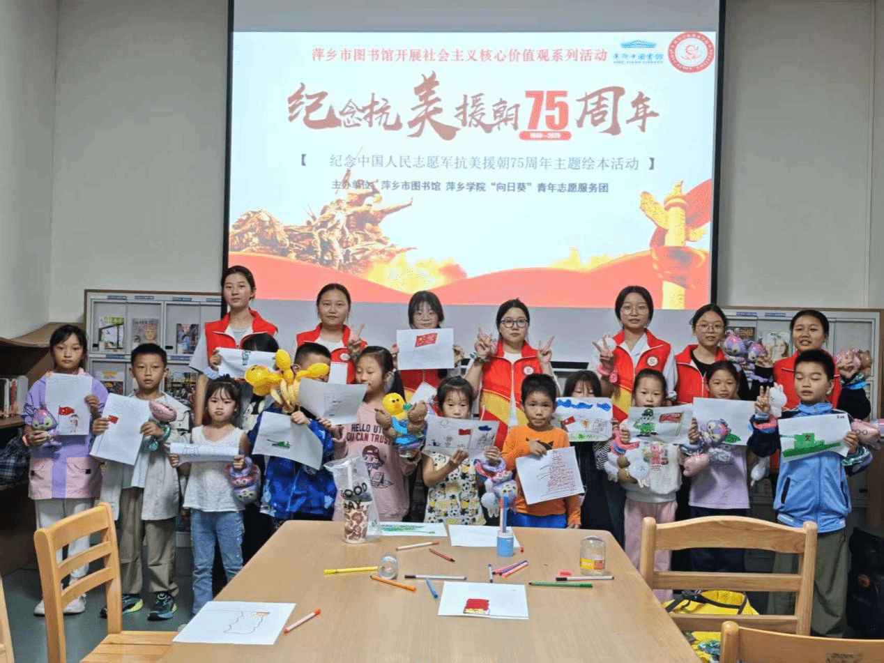 今年正值中国人民志愿军抗美援朝出国作战75周年重要历史纪念节点。为让孩子们感受中国人民志愿军的艰苦奋斗和幸福生活的来之不易,学习抗美援朝精神,萍乡学院“向日葵”青年志愿服务团于10月18日下午在萍乡市图书馆组织开展了“七十又五,精神永续”主题绘本讲解志愿服务活动。此次活动通过生动的绘本故事、互动体验和手工绘画,引导孩子们了解抗美援朝精神,在幼小的心灵中播撒爱国感恩的种子。