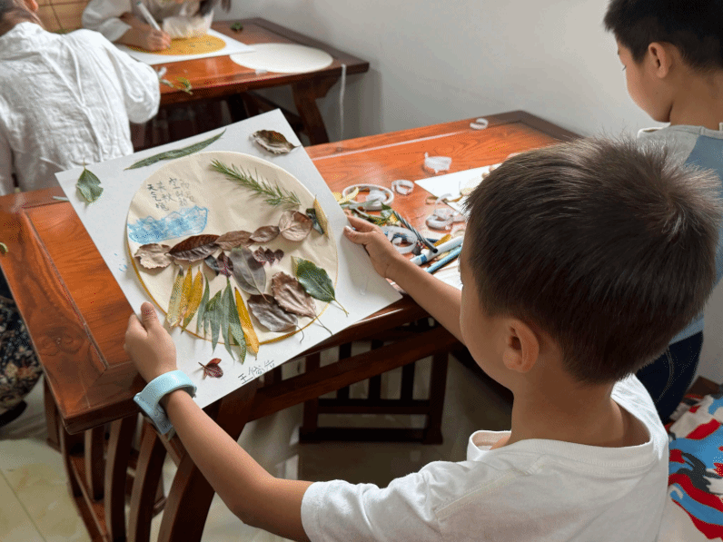 最具创意的当属树叶贴画创作环节,志愿者引导孩子们用准备的枫叶等素材创作一副作品。孩子们或用银杏叶拼出“鸿雁南飞”的队形,或用彩色笔在贴画旁写下“寒露”节气的诗句,现场充满童趣与诗意。“我用深绿色的叶子做了片森林,再画上一群大雁,这样就有寒露的感觉了!”小朋友举着自己的作品兴奋地说。