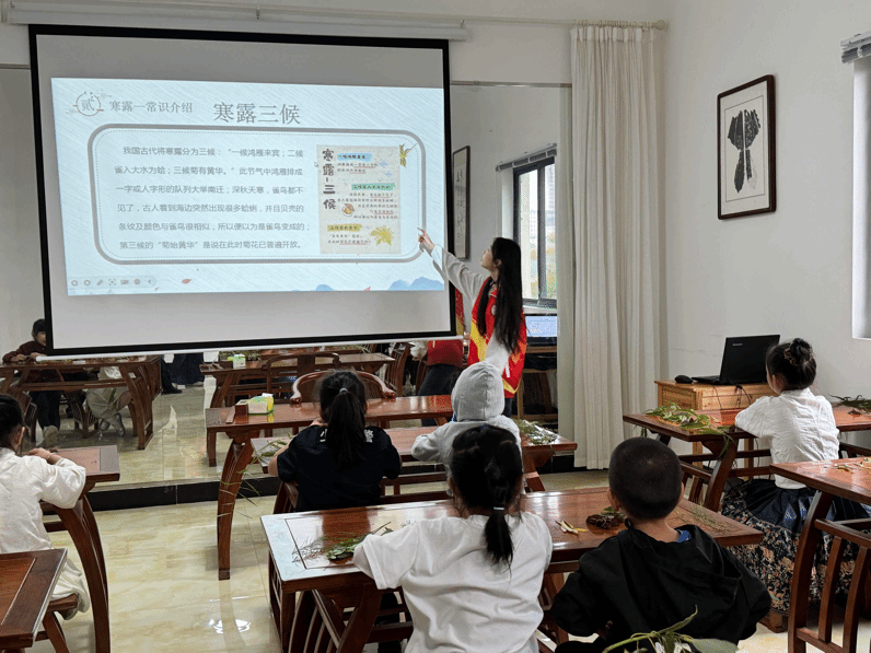 活动开始后,志愿者借助PPT生动解析“寒露三候”:“一候鸿雁南飞,它们会排成人字或一字形队伍;二候雀入大水为蛤,古人觉得蛤蜊花纹像雀鸟;三候菊有黄华,此时菊花开始绽放。”孩子们盯着屏幕上的鸿雁迁徙图和菊花特写,听得格外专注,不少孩子主动举手分享自己见过的秋日候鸟。