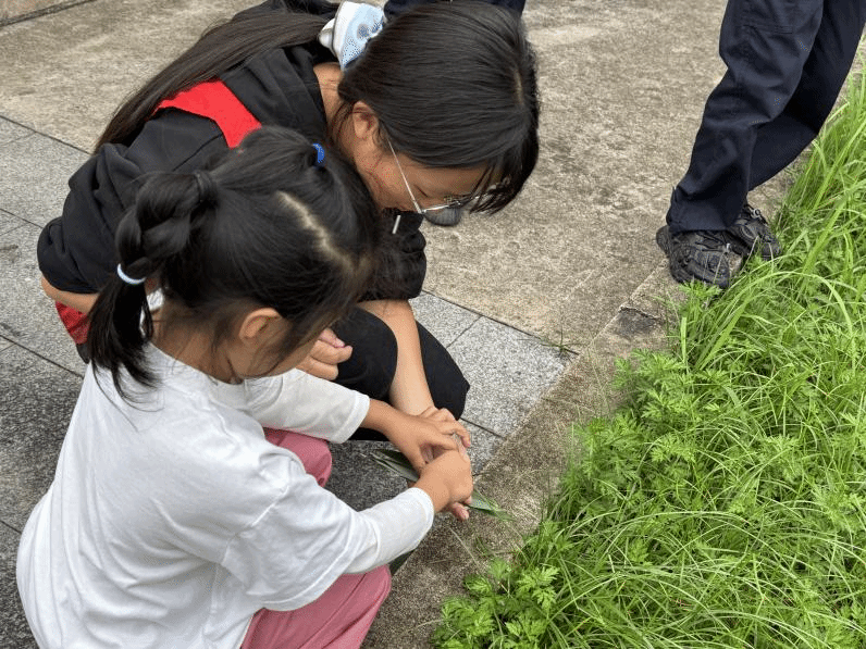 活动开始前,志愿者们带领小朋友们走进社区庭院捡拾落叶,孩子们在捡落叶的同时也在社区绿化带中蹲身观察植物变化。“你们看这片竹叶的边缘,寒露后气温降低,植物的水分代谢也在变化......”志愿者手持叶片,向孩子讲解寒露节气对植物的影响,孩子们好奇地触摸叶片,在真实场景中感知季节更迭。