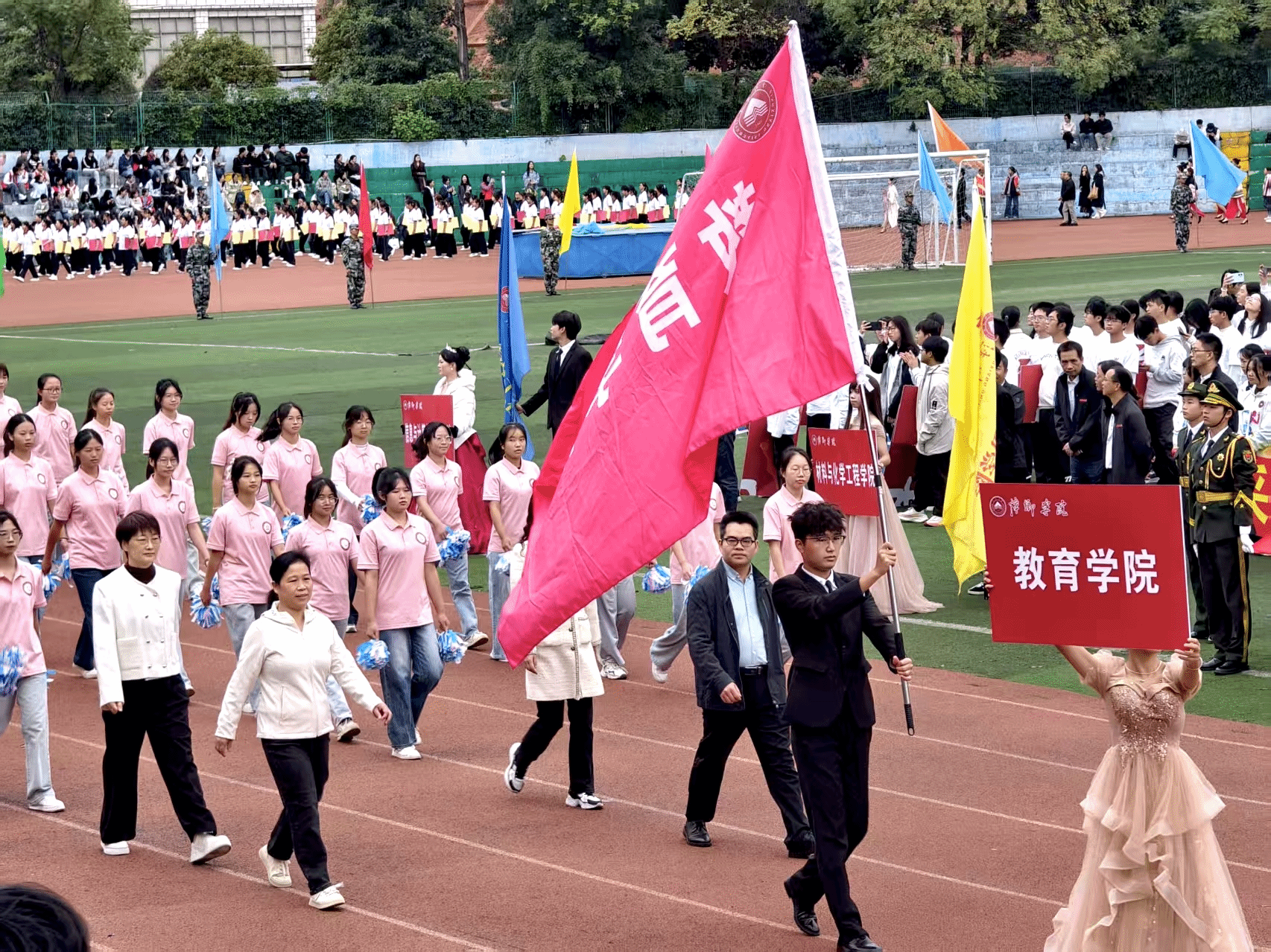 在精彩的开幕式表演环节中,教育学院代表方阵尤为引人注目。同学们身着统一服装,伴随着活泼动感的旋律,为全场师生献上了一场精心编排、充满活力的欢快舞蹈。他们用跃动的身姿、灿烂的笑容和极具感染力的表演,完美诠释了青春的热情与教育学院学子积极向上、团结协作的精神风貌,赢得了看台上的阵阵喝彩与掌声。
