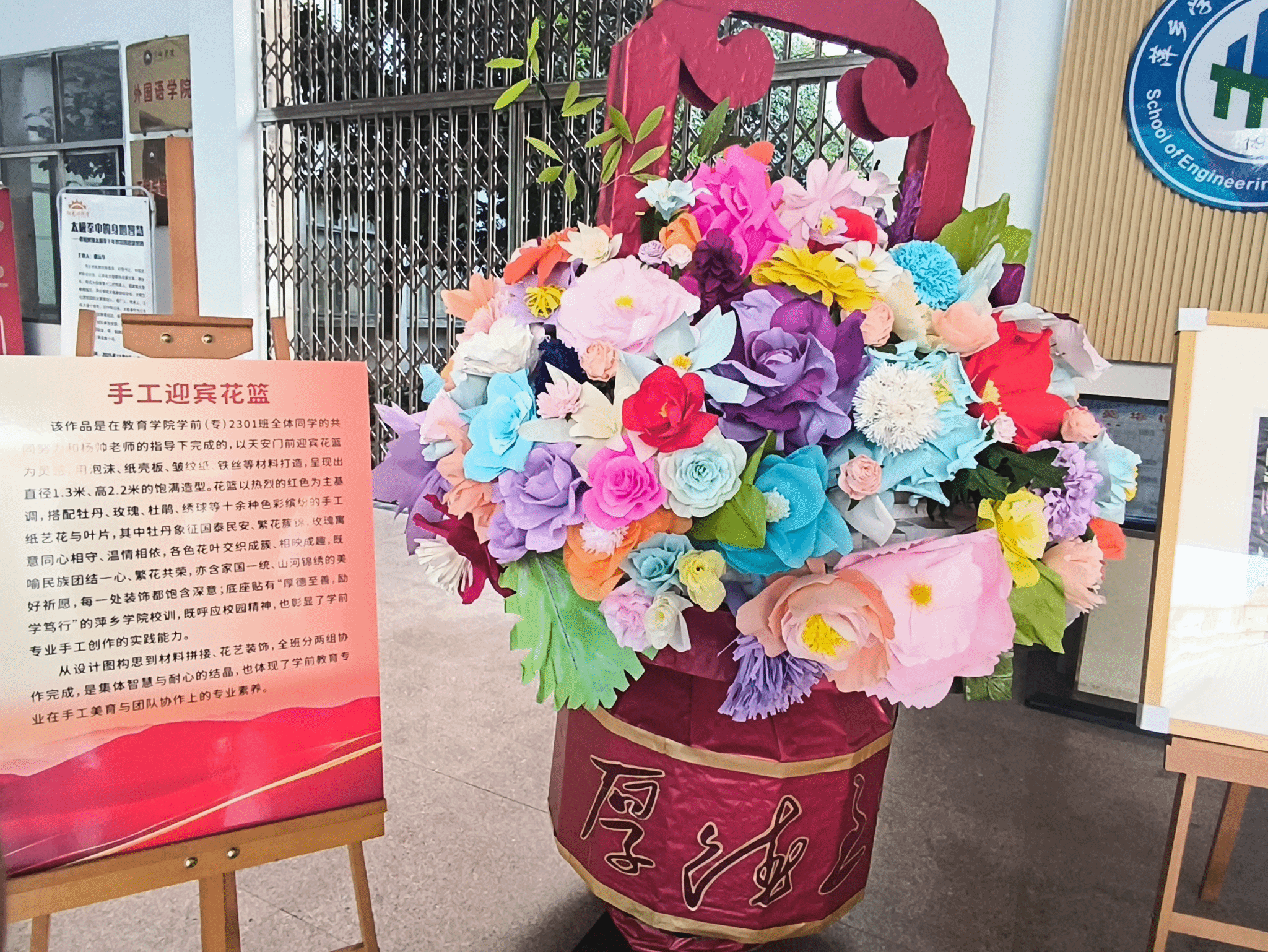在本次展览现场,一件大型手工迎宾花篮吸引了众多师生驻足观赏,该作品由学前教育(专)2301班全体同学在杨帅老师指导下共同创作完成。作品以天安门广场迎宾花篮为设计源泉,同学们巧妙运用综合材料匠心打造出以中国红为主调、缀满各类象征性手工花卉的饱满造型。深情寄托对国泰民安、民族团结的美好祝愿。花篮底座镌刻“厚德至善,励学笃行”的校训,将红色精神、校园文脉与学前教育的专业实践智慧凝练交融。成为展览中一座彰显时代气象与育人初心的精神地标。