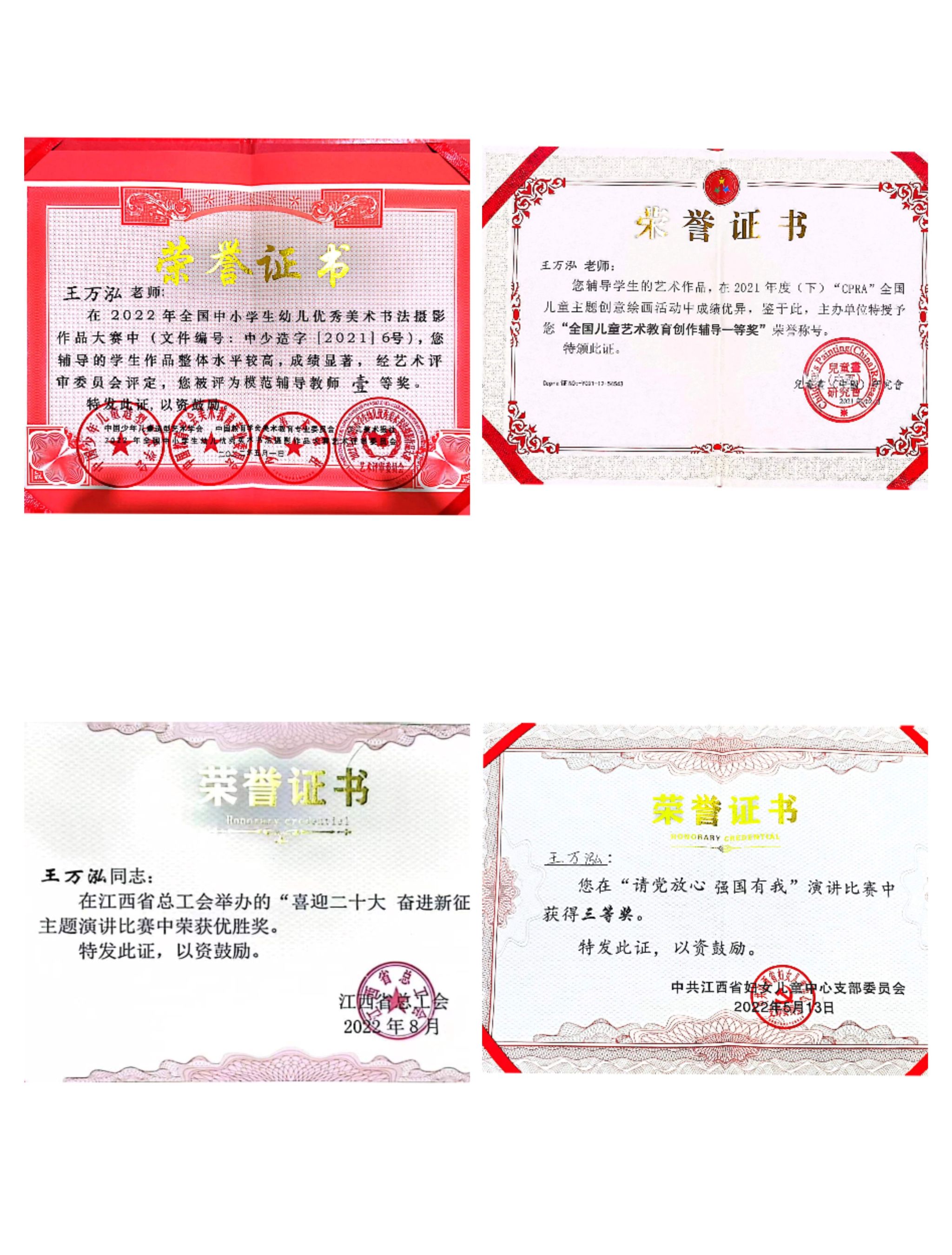 2021年王万泓顺利考入江西省妇女儿童活动中心春蕾艺术幼儿园,成为了一名幼儿教师。在幼儿教师的岗位上,她始终保持一颗热爱幼教事业的诚心,踏踏实实地立足于本职工作。积极参加幼儿园组织的各项活动,在工作中不断收获和成长。2022年“CPRA”全国儿童主题创意绘画活动中荣获全国儿童艺术教育创作辅导一等奖;2022年全国中小学生幼儿优秀美术书法摄影作品大赛中荣获模范辅导教师一等奖;在江西省妇女儿童中心举办的“请党放心强国有我”演讲比赛中获得三等奖;在江西省总工会举办的“喜迎二十大奋进新征程”演讲比赛中获得优胜奖等。