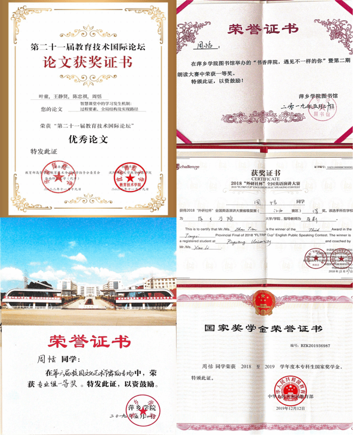 在专业学习上,参与了多项国家级、教育部级以及省部级课题的申报,向国家教育部递交两篇咨询报告均被采纳;两篇会议论文在2022年11月被第二十一届教育技术国际论坛录用并在大会作主题报告,其中一篇被评为优秀论文等。